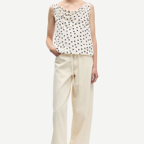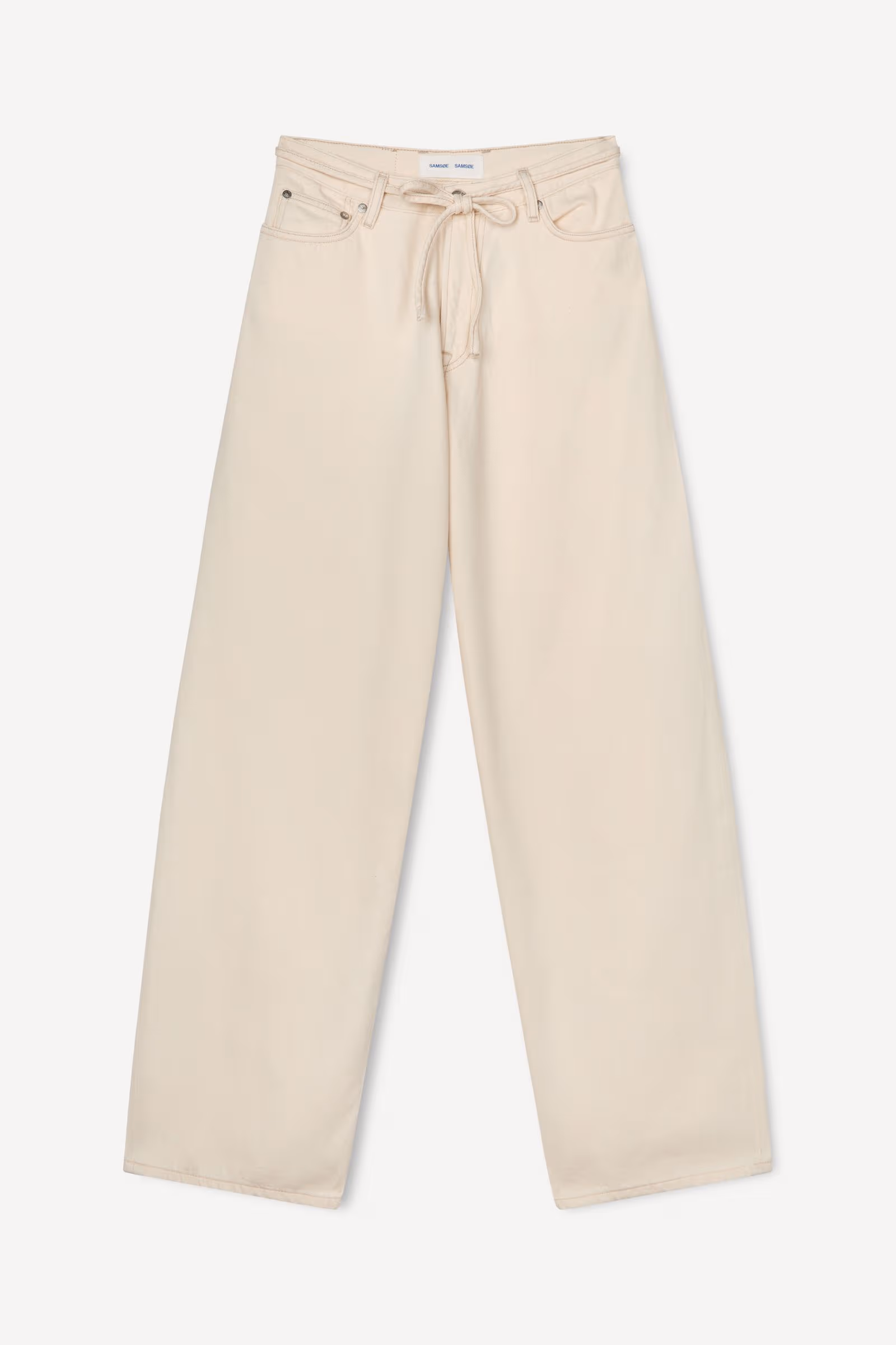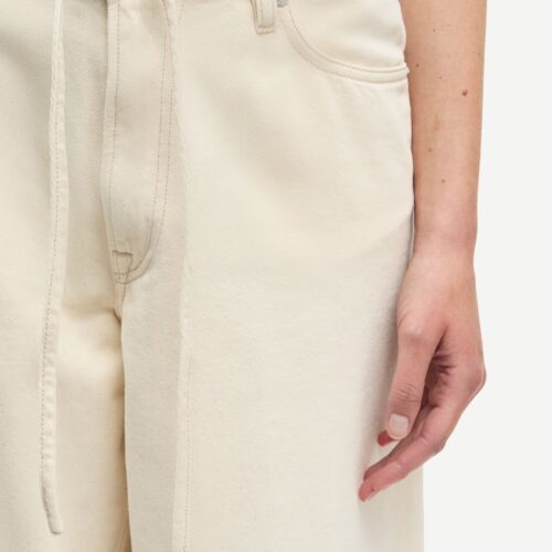 Saharper Jeans Soft Natural. Jeans aus Denim mit lockerer Passform und weitem Bein. Knopf- und Reißverschluss auf der Vorderseite. Five‑Pocket‑Style. Bindegürtel aus demselben Stoff an der Taille. Hauptmaterial gefertigt aus 100 % Bio-Baumwolle.