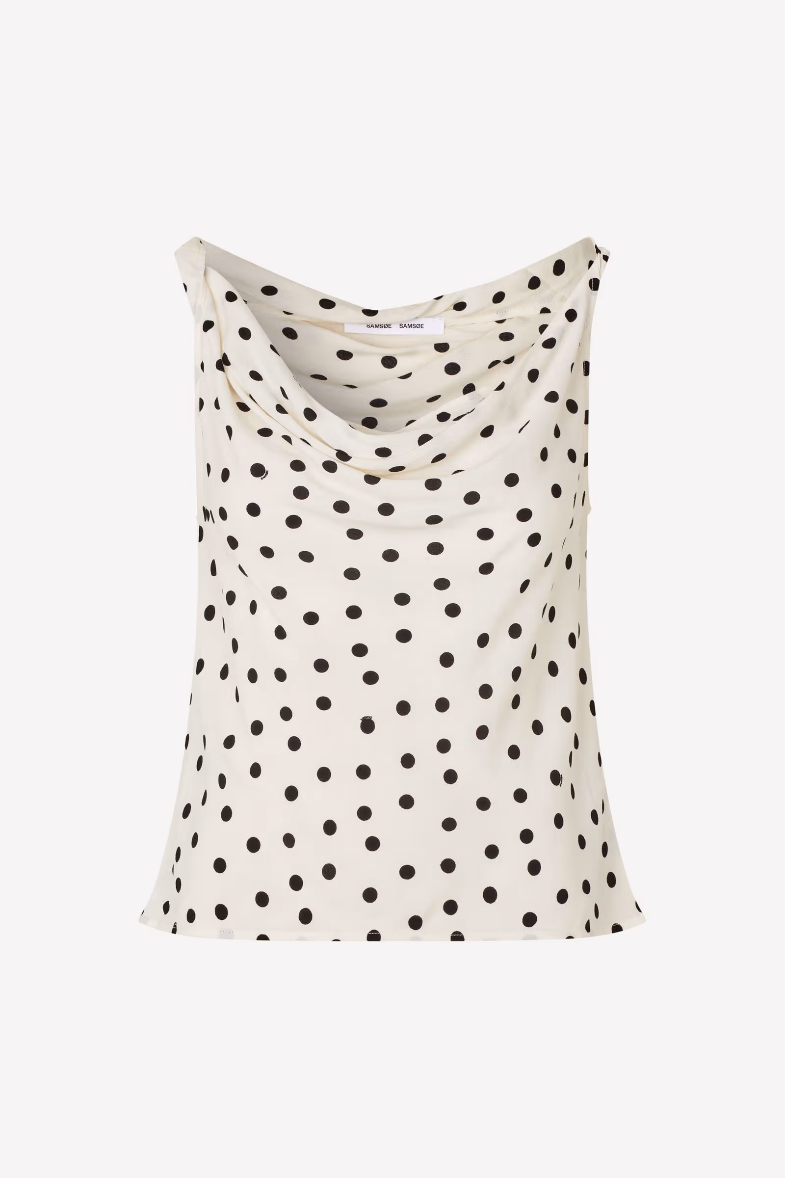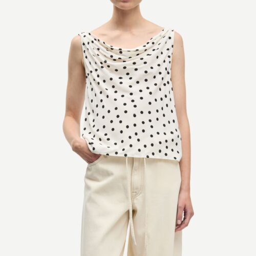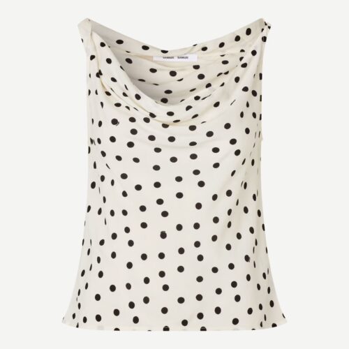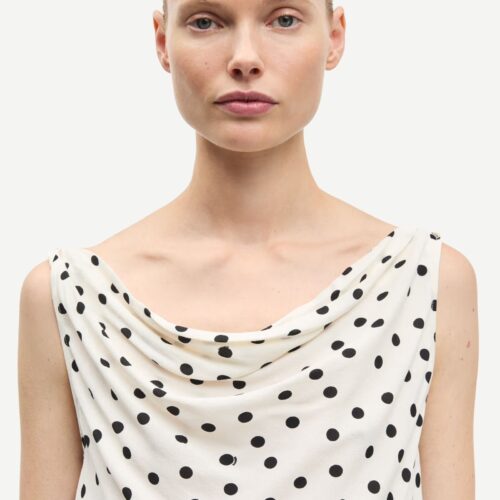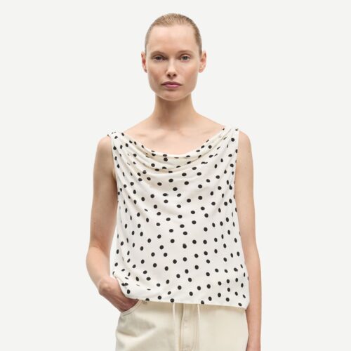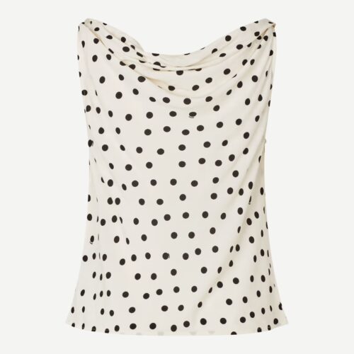 Sapoppy Top Drifting Dots Egret. Ärmelloses Top mit normaler Passform und einem fließenden, drapierten Wasserfallausschnitt, der für eine elegante Silhouette sorgt. Gefertigt aus einem hochwertigen Mix aus Viskose und LENZING™ ECOVERO™ Viskose.